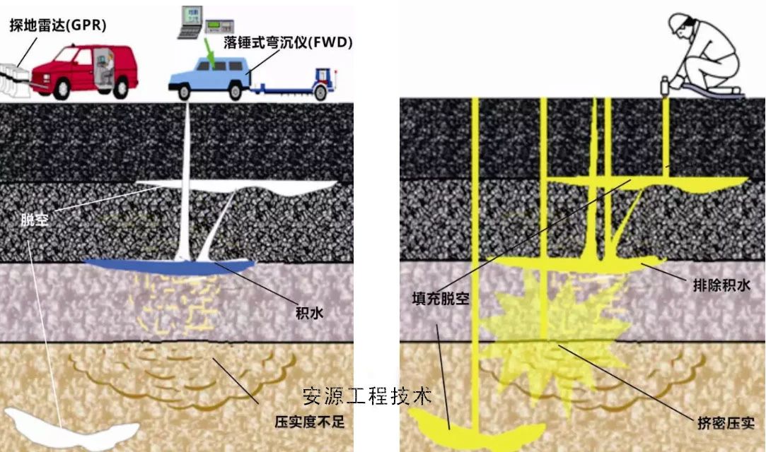 非開挖修復(fù):無需開挖道路,向病害部位填充高聚物注漿材料,快速修復(fù)。相較于傳統(tǒng)開挖修復(fù),具有環(huán)保、快速、耐久、經(jīng)濟(jì)的特點(diǎn)。
