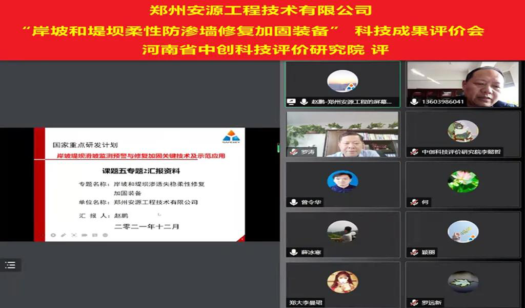 2022年1月12日,河南省中創(chuàng)科技評價研究院依據(jù)科技部《科學(xué)技術(shù)評價辦法》有關(guān)規(guī)定,對我司完成的“岸坡和堤壩柔性防滲墻修復(fù)加固裝備”項目進行了科技成果評價。公司總經(jīng)理趙鵬作題為《岸坡堤壩滑坡監(jiān)測預(yù)警與修復(fù)加固關(guān)鍵技術(shù)與示范應(yīng)用》的課題匯報,介紹技術(shù)的基本情況及核心技術(shù)要點。